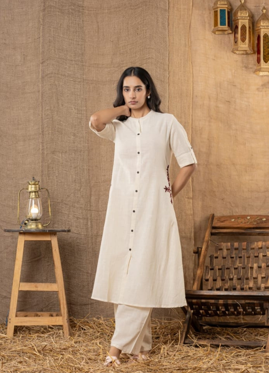 Beige Cotton Slub Kurta and Palazzo Set with Brown Embroidery