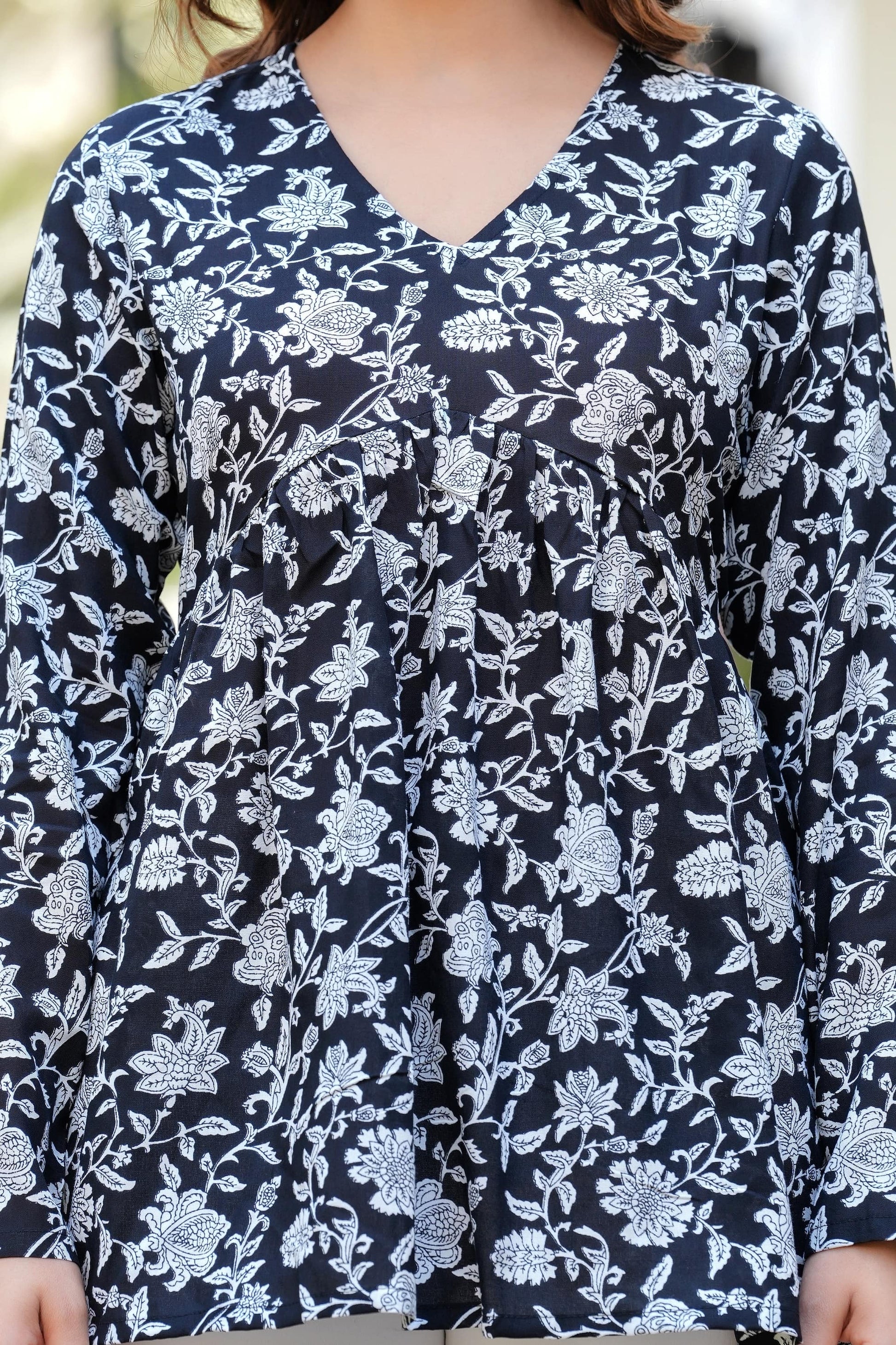 Elevate your everyday look with this Black Cotton Top, beautifully adorned with intricate white floral prints for a timeless and elegant style. Designed with a flattering V-neckline, gathered waistline, and full sleeves, this top combines comfort with sophistication. Pair it with jeans, trousers, or leggings for a versatile outfit that’s perfect for casual outings, office wear, or relaxed evenings.