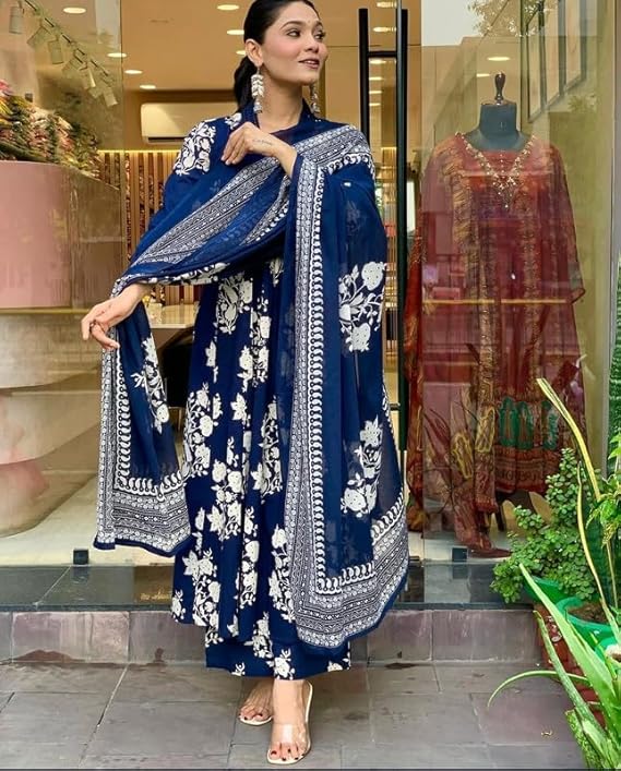 Add timeless elegance to your ethnic collection with this Komfortive™ Navy Blue Cotton Kurta Set with Dupatta. Crafted in premium breathable cotton, it features intricate white floral prints on a rich navy base, offering both comfort and sophistication. Perfect for festive occasions, weddings, and parties, this set combines traditional artistry with modern style.
