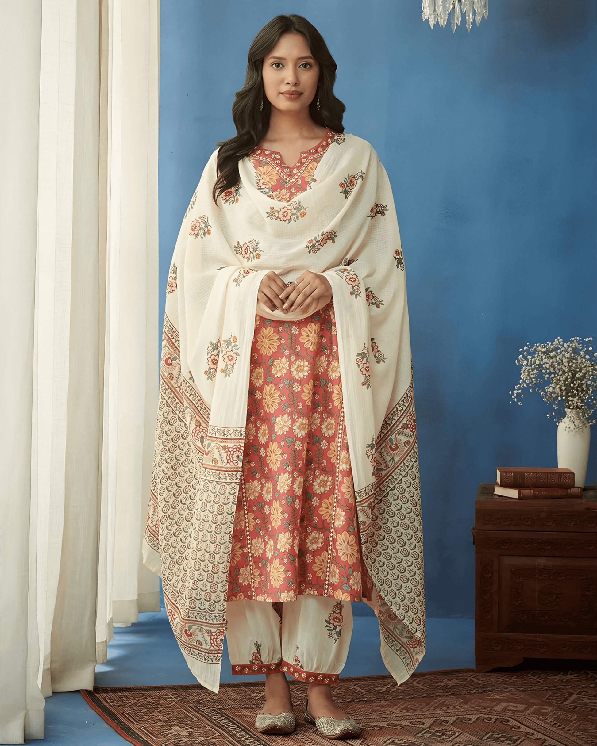 Printed Premium Cotton Kurta Set with Palazzo & Dupatta - Soft & Breathable
