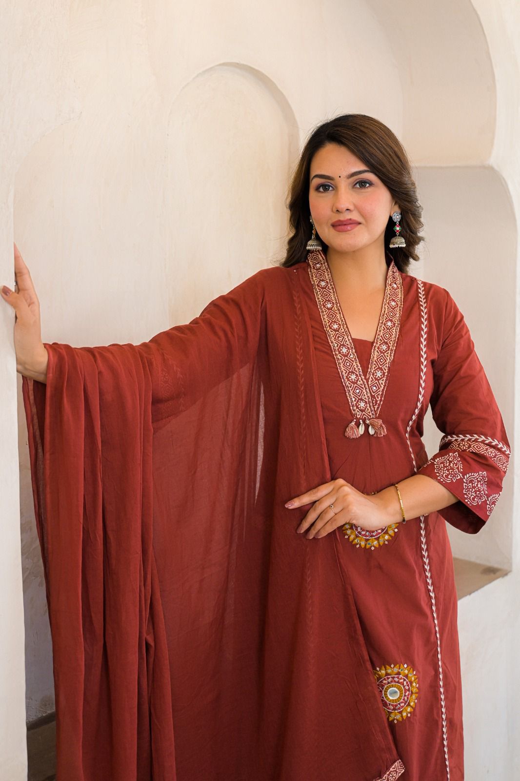 Step into effortless elegance with this Rust Brown Cotton A-Line Suit Set from Komfortive™. Designed with beautiful mirror-style embroidery and fine thread detailing, this outfit brings together traditional charm and modern comfort. Crafted with full cotton lining and a side pocket, it ensures both style and practicality. Perfect for festive occasions, family gatherings, or elegant everyday wear.