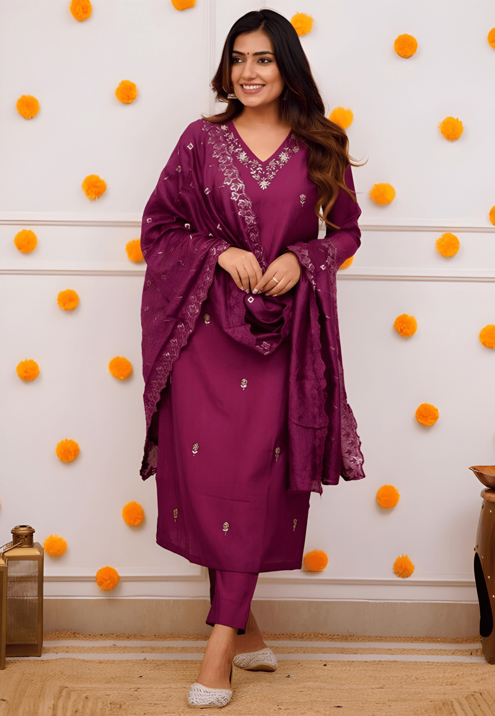 Wine Purple 3-piece Viscose Kurta Set for Women featuring delicate thread embroidery, solid straight-fit pants, and a soft embellished dupatta. Ideal for festive gatherings or graceful office attire.